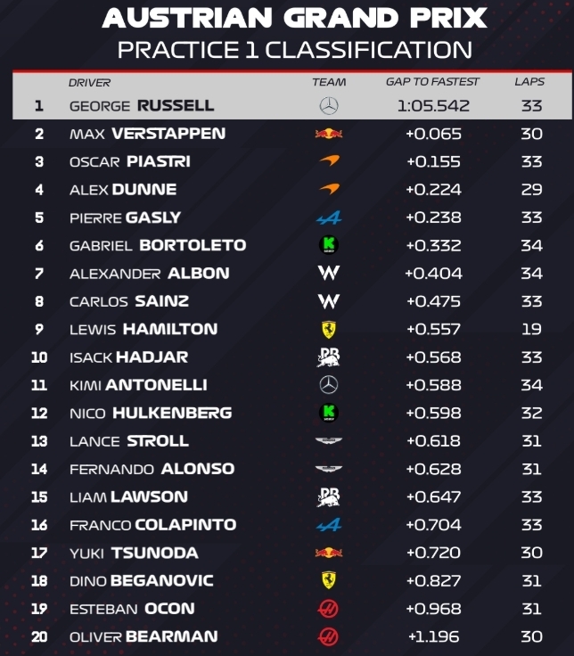 Отметим, что в первой практике шанс получили многие молодые гонщики. Ландо Норриса подменил Алекс Данн и показал 4-е время, а в Феррари вместо Шарля Леклера тренировку провел Дино Беганович.