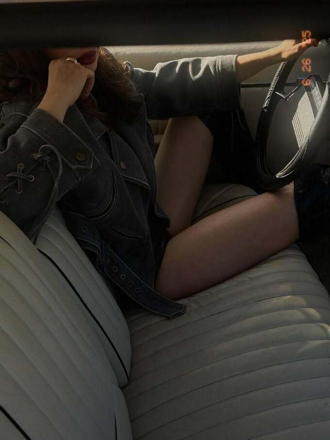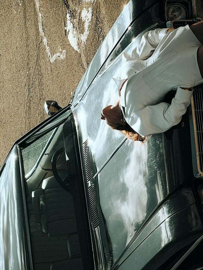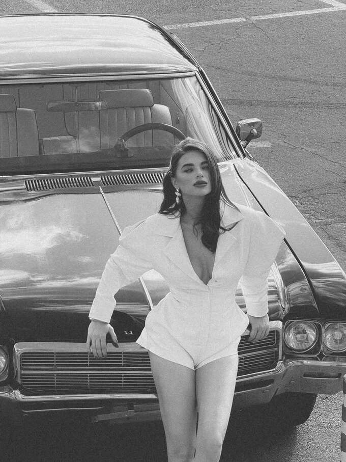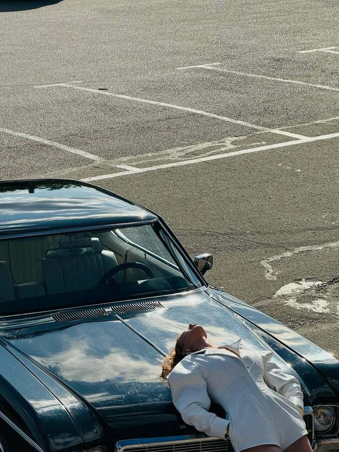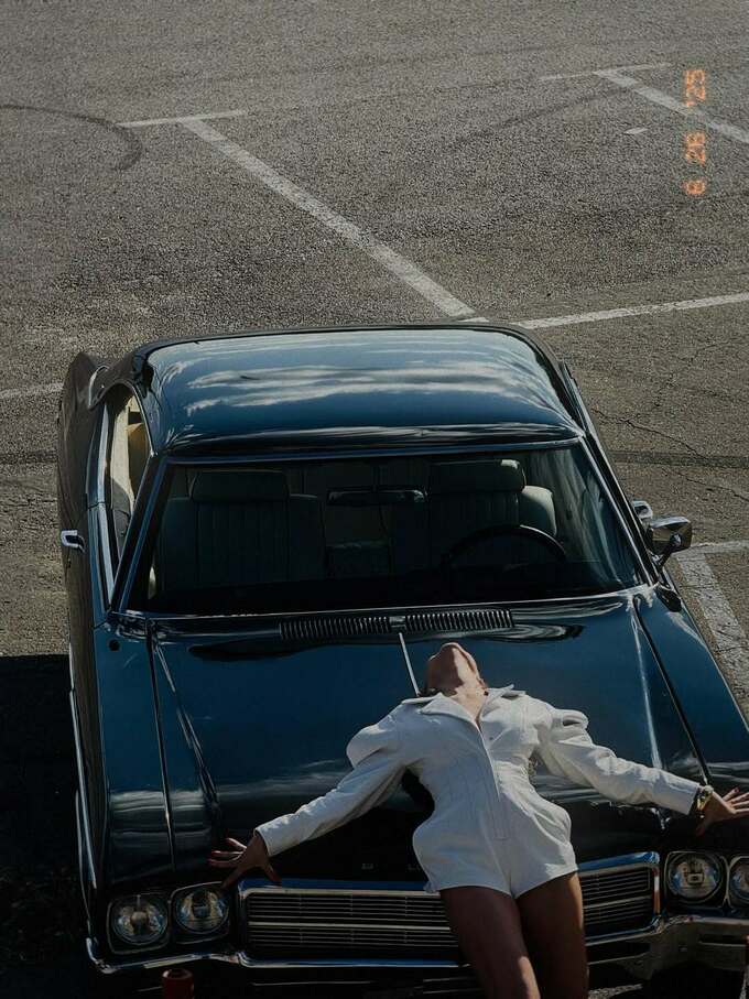 Яркие красные губы и ретро-автомобиль на фоне подчёркивают атмосферу утончённой женственности.