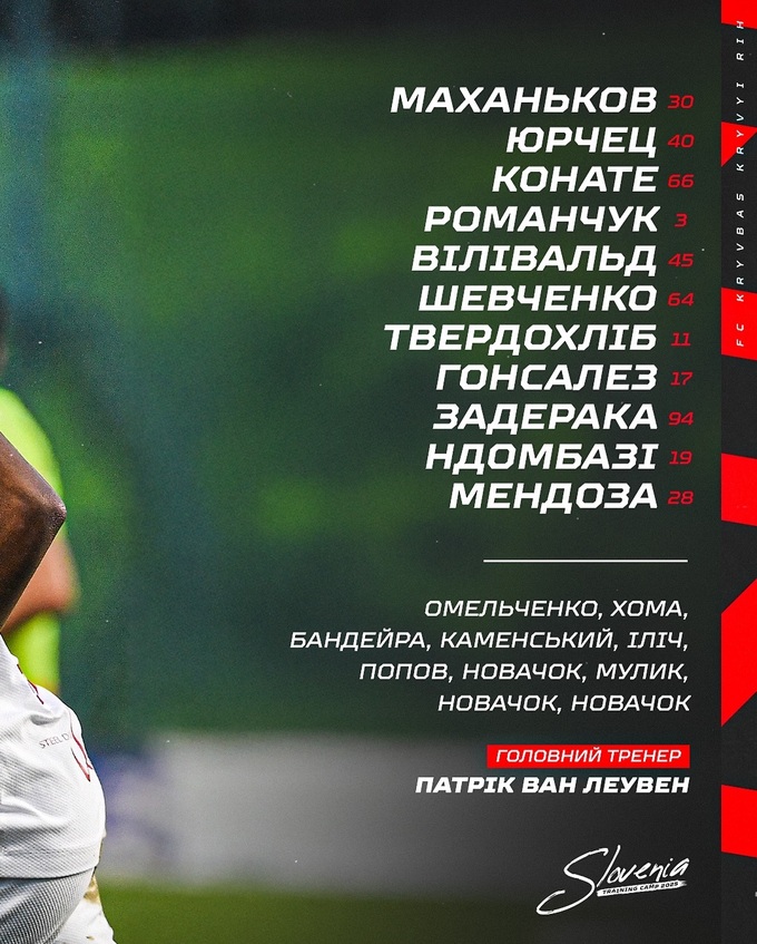 Кривбасс (стартовый состав): Маханьков, Юрчец, Конате, Романчук, Виливальд, Шевченко, Твердолхиб, Гонсалез, Задерака, Ндомбази, Мендоза.