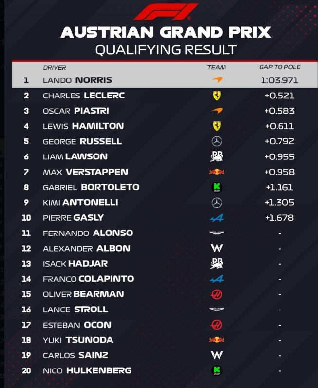 Состоялась квалификация Формулы-1 в рамках Гран-при Австрии. Поул завоевал пилот Макларена Ландо Норрис, который опередил пилота Феррари Шарля Леклера и напарника Оскара Пиастри.