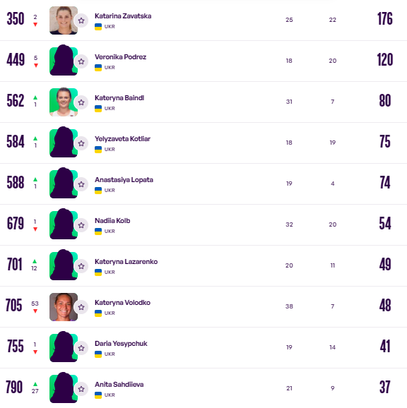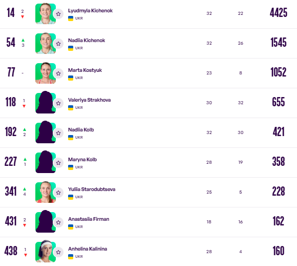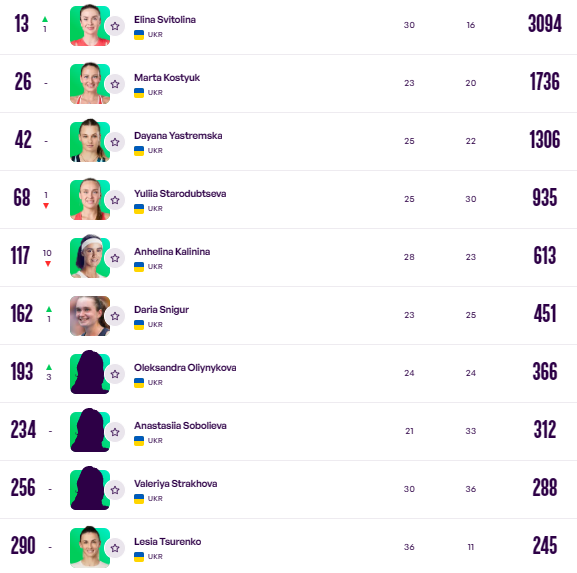 Марта Костюк (26-я) и Даяна Ястремская (42-я) сохранили свои позиции. Остались на своих местах и Анастасия Соболева (234-я) и Леся Цуренко (290-я).