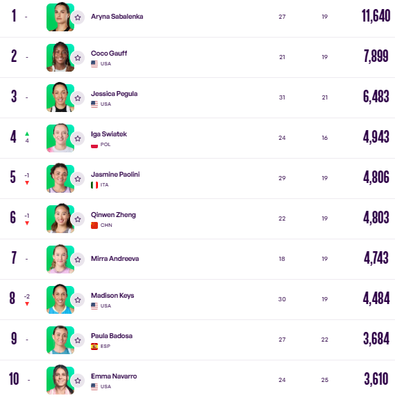 А вот финалистка немецкого пятисотника Ига Свентек поднялась с восьмого на четвертое место. Ига опустила Жасмин Паолини (5-я) и Чжэн Циньвень (6-я) на одну позицию, а Мэдисон Киз (8-я) – на две.