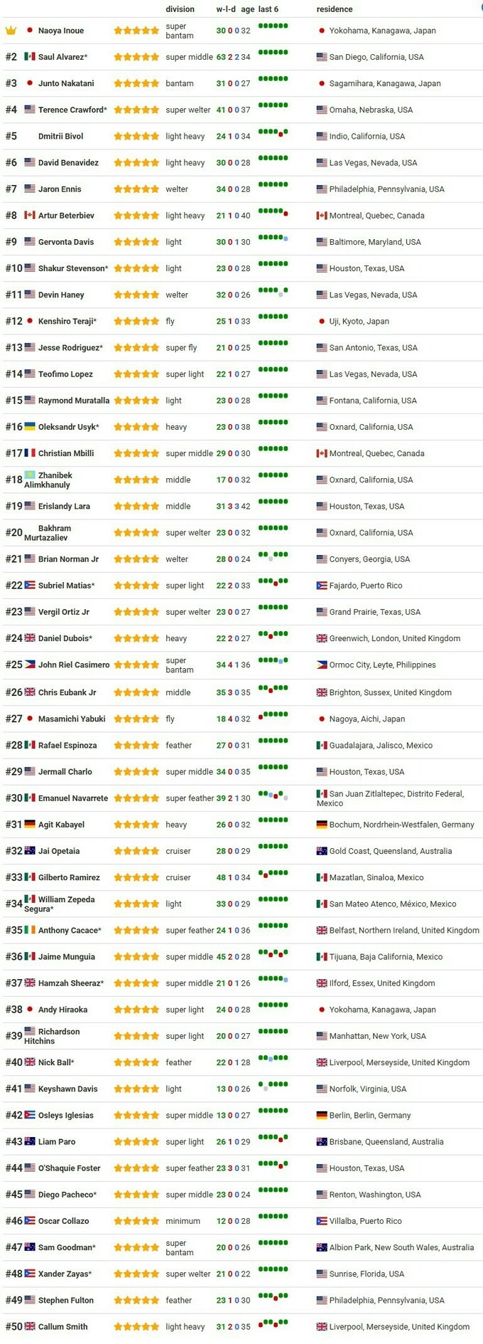 В тройку лучших входят два японца: лидирует Наоя Иноуэ, а Дзюнто Накатани – на третьей позиции. Второе место занимает мексиканец Сауль Альварес, а 4-м идет американец Теренс Кроуфорд.