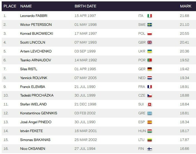 - 1. Леонардо Фаббри (Италия) – 21.68 м