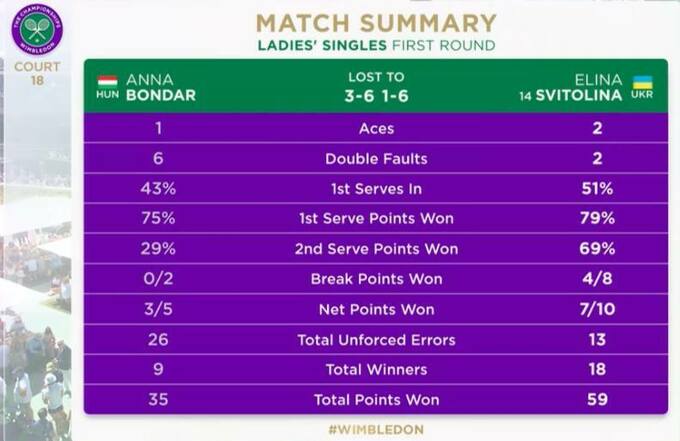 Kicking off her campaign! 💚@ElinaSvitolina defeats Bondar 6-3, 6-1 to book her spot into the next round. #Wimbledon pic.twitter.com/7z5ugPQywX