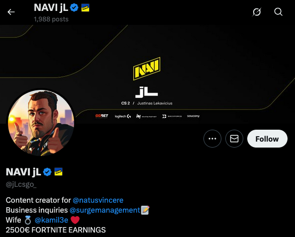 Неожиданной деталью стало изменение в профиле Юстинаса «jL» Лекавичюса в соцсети X. В графе описания больше не указано, что он является профессиональным игроком Natus Vincere – теперь там написано, что он контент-криэйтор клуба.