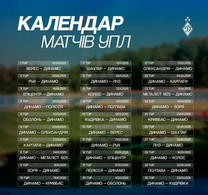 Первое противостояние двух грандов состоится в 11-м туре, дата – 1 ноября 2025 года. Динамо примет Шахтер в Киеве.