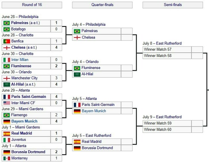 Таким образом, определены все четвертьфинальные пары турнира. В первый игровой вечер 4 июля встретятся: Флуминенсе (Бразилия) – Аль-Хиляль (Сауд. Аравия), Палмейрас (Бразилия) – Челси (Англия), а вечером 5 июля сыграют: ПСЖ (Франция) – Бавария (Германия), Реал (Испания) – Боруссия Д (Германия).