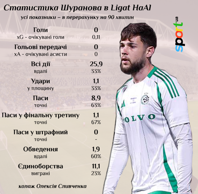 Всего в чемпионате Израиля Шуранов за два года провел 7 матчей (188 минут), в которых не сумел отличиться результативными действиями и абсолютно разочаровал болельщиков, ждавших от Эрика значительно большего. Если во Второй Бундеслиге на счету форварда было по 0,42 забитых мяча в пересчете на каждые 90 минут игры при среднем показателе ожидаемых голов в 0,33xG, то статистика в Израиле у Шуранова оказалась просто отвратительной…