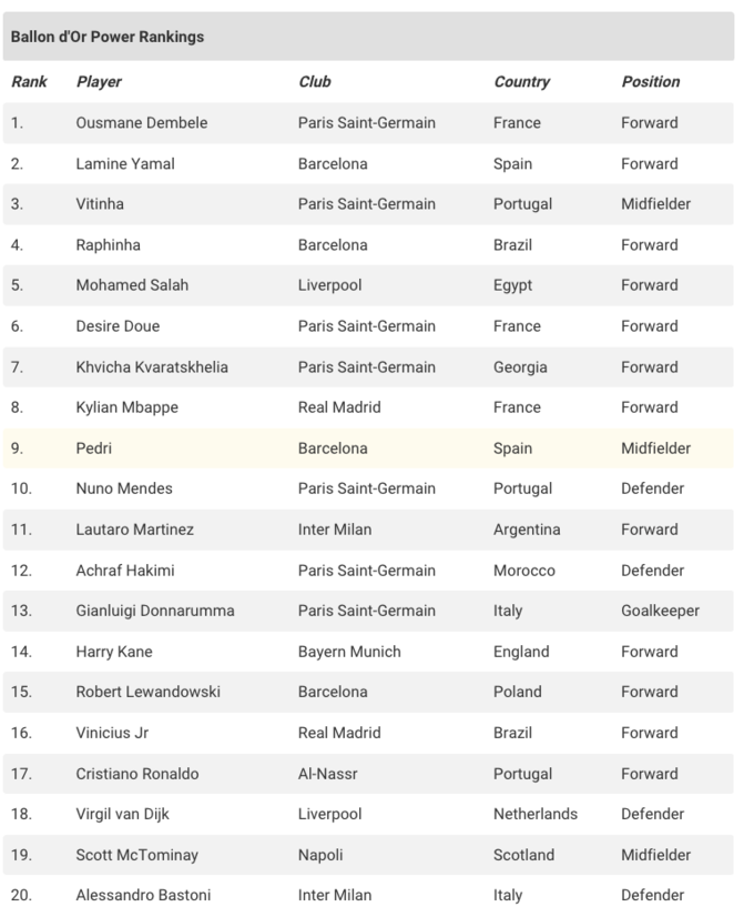 Главным фаворитом на награду остался Усман Дембеле, за ним разместился лидер «Барселоны» – Ламин Ямаль. Бронза досталась Витиньи из «ПСЖ», который помимо требла недавно выиграл Лигу наций.