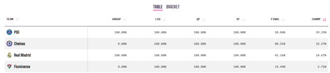Статистический портал Opta обнародовал список фаворитов на победу в турнире. На вершину вновь вернулся «ПСЖ» с 39,33%. Вторую строчку занимает «Челси» с 33,27%. «Реал» с 24,67% обнаружил себя на треьей строчке рейтинга, а на победа «Флуминенсе» дают всего лишь 2.72%.