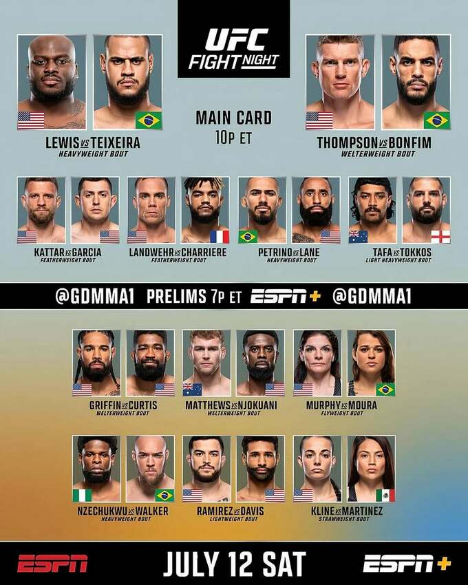 Главным событием шоу станет бой в тяжелом весе (до 120,2 кг) – в октагоне встретятся бывший претендент на пояс чемпиона Деррик Льюис (28–12) из США и непобежденный бразилец Таллисон Тейшейра (8–0).