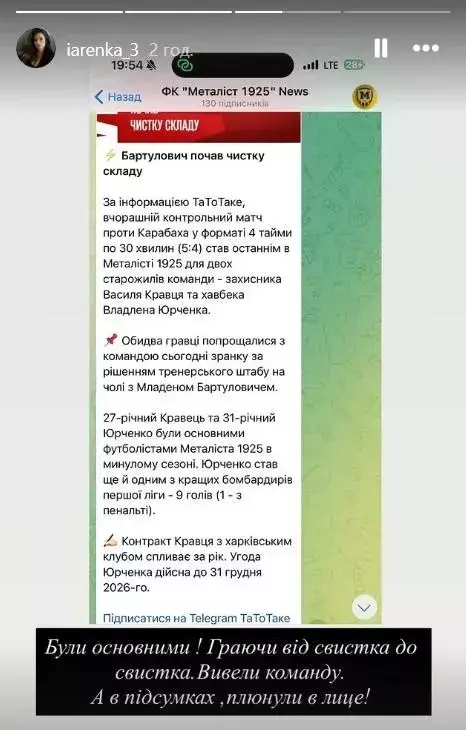 «Были игроками основы! Играли от свистка до свистка. Вывели команду. А в итоге плевок в лицо!», – написала жена Василия Кравца.