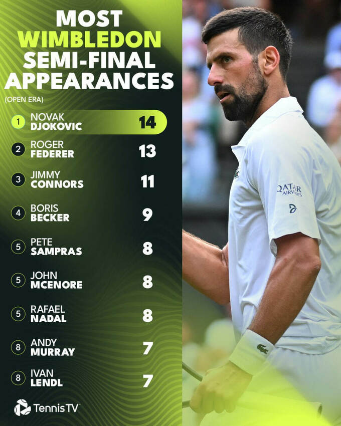 Новак побил рекорд легендарного швейцарца Роджера Федерера по количеству выходов в стадию 1/2 финала травяного мейджора. У Федерера, который восемь раз становился чемпионом в Лондоне (Новак – семикратный победитель), 13 таких поединков.