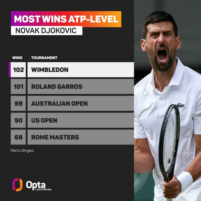 Джокович добыл 102-победу на кортах Уимблдона. Это его наилучший показатель викторий на одном турнире за всю карьеру.