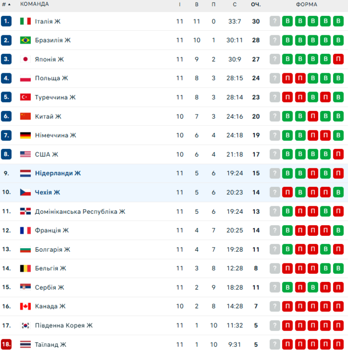 Благодаря этой победе Нидерланды поднялись на девятую позицию в таблице (5 побед, 15 очков), опередив Чехию (5 побед, 14 очков). США пока замыкают восьмерку лучших (6 побед, 17 очков) и могут гарантировать себе место в финале, если наберут хотя бы два очка в последних двух матчах.