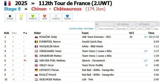 После девятого этапа лидером генеральной классификации остается Тадей Погачар. Ремко Эвенпул отстает на 54 секунды.