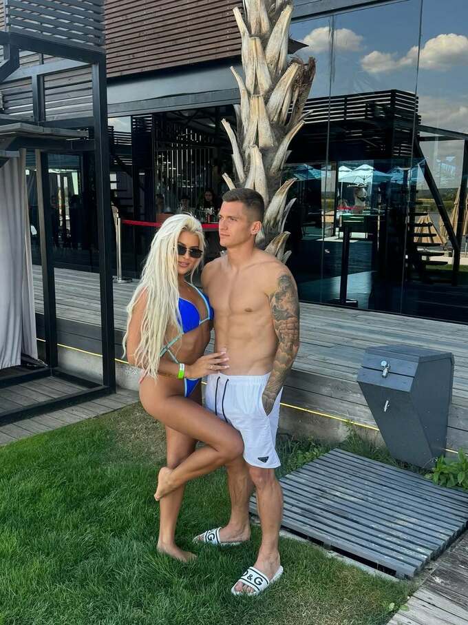 На фото футболист позирует с обнажённым торсом, демонстрируя отличную физическую форму, а его девушка Карина Проценко — в эффектном купальнике, подчёркивая свою фигуру.