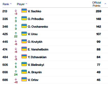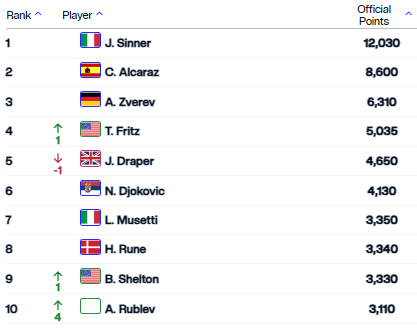 Из изменений в топ-10: Тейлор Фритц обошел Джека Дрейпера и стал четвертой ракеткой мира, Бен Шелтон поднялся на девятую строчку и обновил личный рекорд, Андрей Рублев стал 10-м.