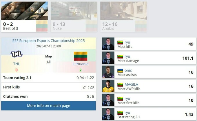 Сборная Украины, выступающая под тегом TNL, завершила выступление на European Esports Championship 2025 на почетном втором месте. В гранд-финале украинцы уступили сборной Литвы со счетом 0:2, проиграв на картах Nuke (9:13) и Anubis (12:16).