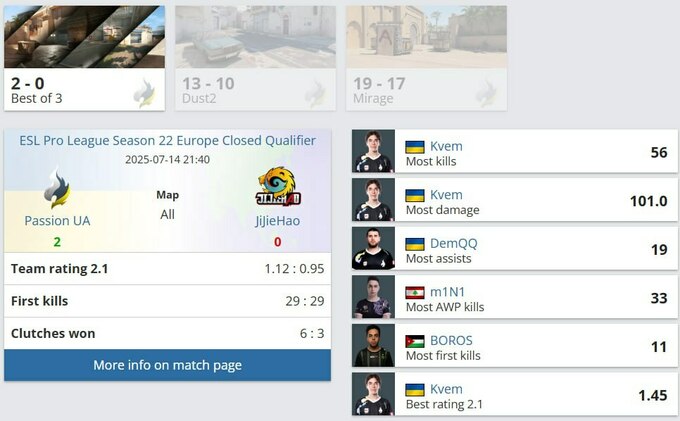 Сегодня ночью, 15 июля, завершились матчи украинских команд в рамках закрытой европейской квалификации на ESL Pro League Season 22. Passion UA и fnatic – выступающие под украинским флагом – одержали важные победы в стартовых поединках турнира.