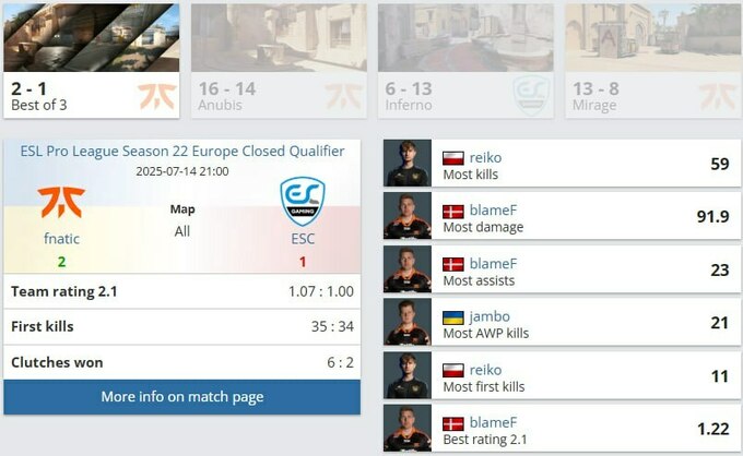 Fnatic также провела напряженный матч с польским коллективом ESC. На Anubis украинцы выиграли в овертайме – 16:14. При этом на Inferno fnatic не удалось наладить игру, команда уступила 6:13.