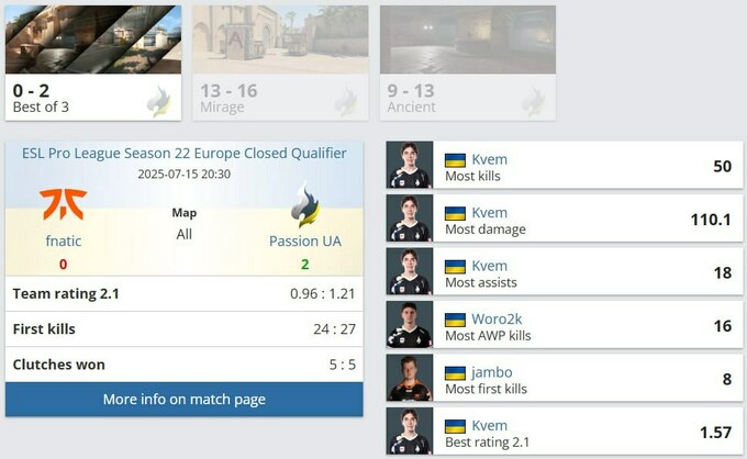 В матче нижней сетки Passion UA встретились с fnatic и не оставили им ни единого шанса. Mirage оказался непростым, но под контролем – 16:13. На второй карте, Ancient, украинцы продолжили доминировать и уверенно выиграли 13:9. Абсолютным героем встречи стал Kvem – 50 фрагов, 110.1 урона и рейтинг 1.57.