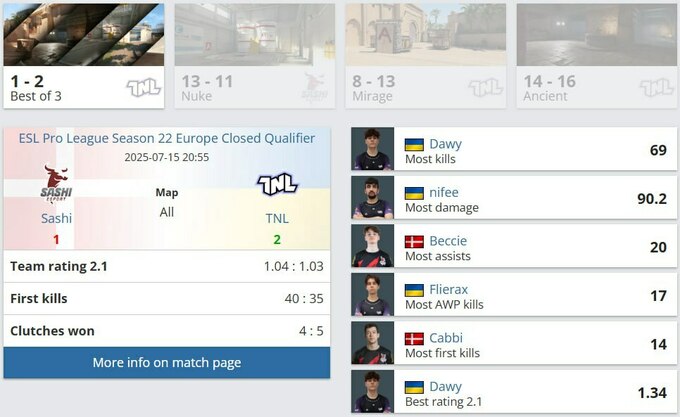 Первую карту Nuke украинцы уступили с минимальным отрывом, но на Mirage смогли взять реванш. Решающая карта – Ancient – выдалась напряженной: обе команды имели шансы, но TNL все же оказались сильнее и закрыли карту со счетом 16:14. Лучшим игроком матча стал Dawy с 69 фрагами и рейтингом 1.34.
