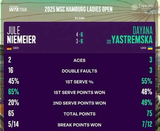 Соревнования в Гамбурге для Даяны первые после Уимблдона-2025, где она добралась до 1/16 финала и потерпела поражение от Джессики Бузас Манейро.