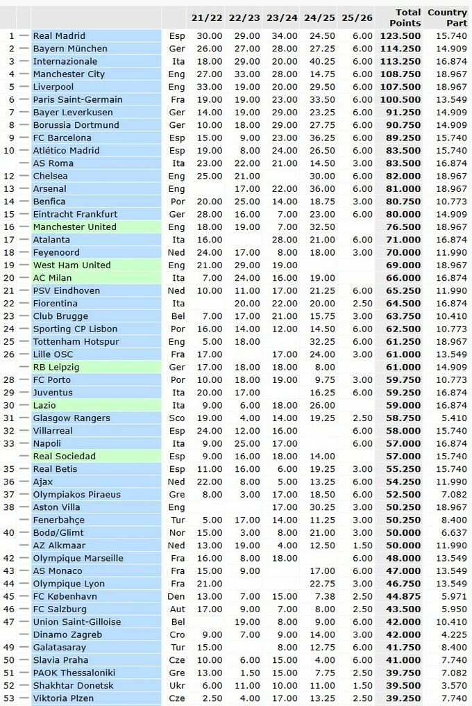 Список топ-команд, которые остались без еврокубков (отмечены зеленым ниже)