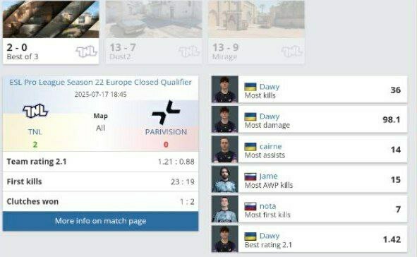 С каждым матчем TNL лишь набирали обороты: сначала они прошли Sashi, затем почти закрыли Nemiga на двух картах, а в финале уверенно разобрались с PARIVISION.