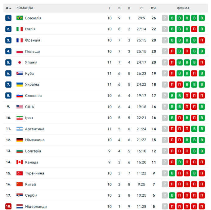 Турнирное положение Лиги наций по волейболу: Бразилия (26 очков), Италия (22 очка), Франция, Польша, Япония (20 очков), Куба (19 очков), Украина (18 очков), Словения (17 очков), США, Иран (16 очков), Аргентина (14 очков), Германия (15 очков, но меньше побед), Болгария (12 очков), Канада (11 очков), Турция (9 очков), Китай (7 очков), Сербия (6 очков), Нидерланды (5 очков).