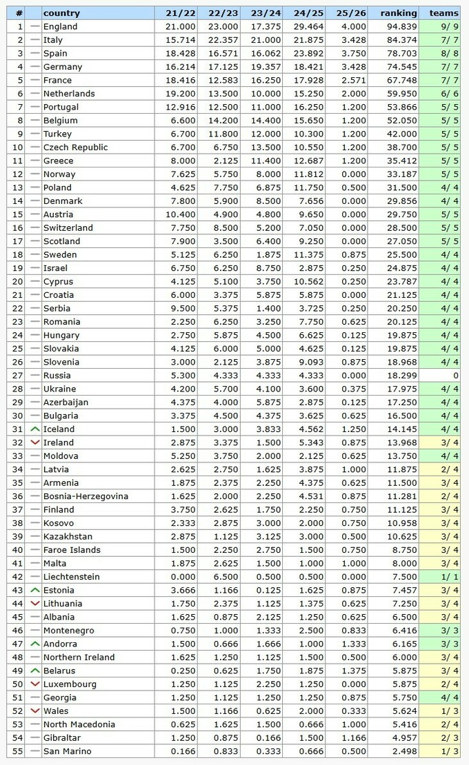 Словакия взяла одно очко благодаря ничьей Спартака Трнава, но этот клуб перешел из Лиги Европы в Лигу конференций. Словения имела сразу три клуба в первом раунде и заработала 1.5 очка – в коэффициентах это прибавка 0.375.