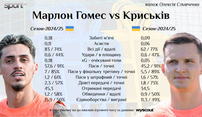 Если опираться на статистические данные минувшего сезона и начала нынешнего, то работоспособность Крыськива на поле, выраженная через показатель общего количества действий, значительно уступает аналогичному показателю Марлона Гомеса, в пересчете на 90 минут чистого игрового времени – 62 против 83. Крыськив значительно меньше, нежели бразилец, получает мяч (34 раза за 90 минут против 45), а также реже идет в единоборства и выходит из них победителем.
