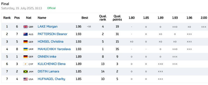 Высоту 1.93 метра взяли 4 спортсменки – Элеанор Паттерсон (с первой попытки), Кристина Хонзель (со второй), Морган Лейк и Ярослава Магучих (с третьей).