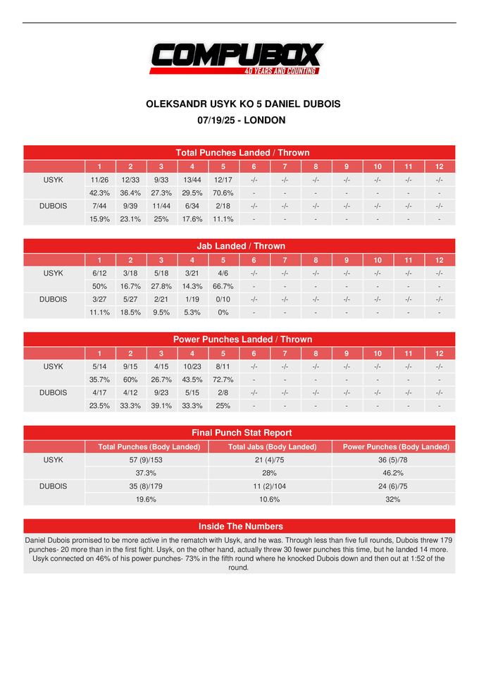 Статистический портал Compubox опубликовал количество ударов, которые выбросили оба боксера за пять раундов. Оказалось, что до момента остановки боя Дюбуа бил чаще, чем его соперник – 358 против 306 в Усика.