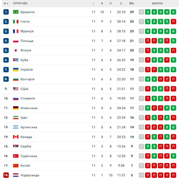 После этого матча Италия имеет в своем активе девять побед и 25 очков, занимая второе место в турнирной таблице. Они уже не могут догнать лидера – сборную Бразилии (10 побед, 29 очков), но опережают третью в таблице Францию (8 побед, 23 очка) на одно очко и одну победу. Польша, занимающая четвертое место (7 побед, 21 очко), также гарантировала себе выход в финал.