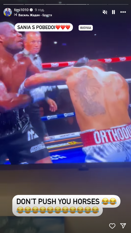 Стоит пояснить, что «Don't push you horses» – это отсылка на свежий мем, который на пресс-конференции перед боем с Дюбуа создал сам Усик, сказав «Don't push the horses» и введя этим в ступор всех иностранцев.