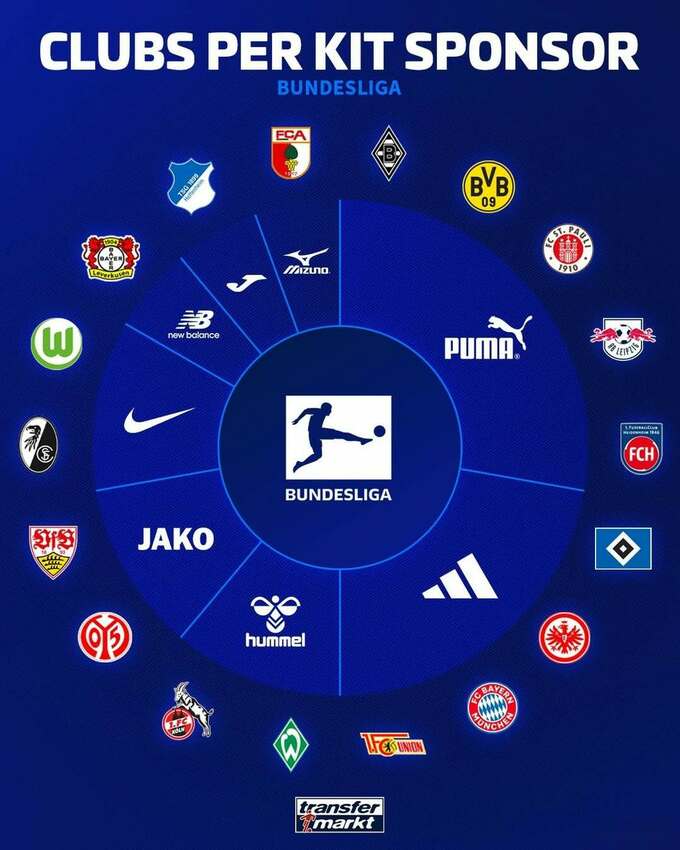 На первом месте по количеству клубов, использующих комплекты форм с логотипом бренда – Puma, который представлен в пяти командах («Боруссия» Дортмунд, РБ «Лейпциг», «Боруссия» Менхенгладбах, «Хайденхайм», «Санкт-Паули»).