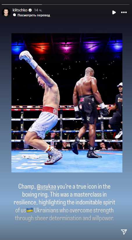 «Чемпион, ты настоящая икона на боксерском ринге. Это был мастер-класс по стойкости, который подчеркнул несокрушимость духа нас, украинцев, которые пересиливают себя благодаря решимости и силе воли».