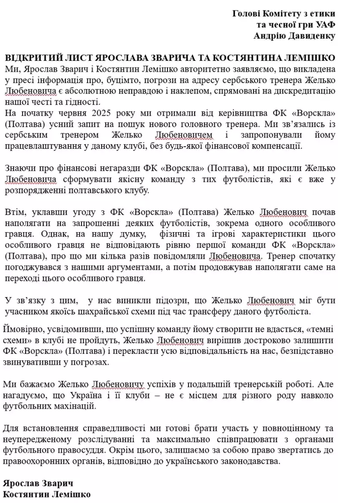 Письмо Зварича и Лемишко в адрес главы Комитета по этике и честной игре УАФ