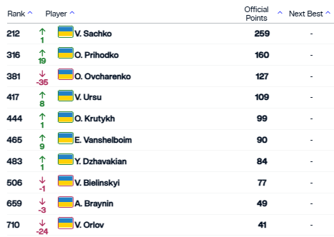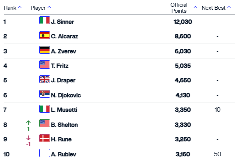 Лидером рейтинга остается Янник Синнер. Следом за ним идут Карлос Алькарас, Александр Зверев, Тейлор Фритц и Джек Дрейпер.