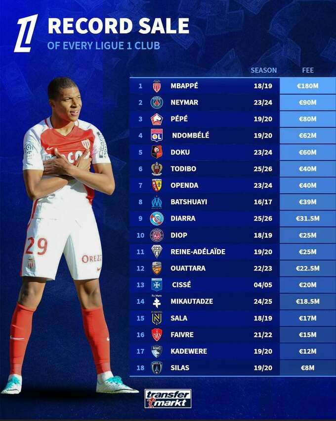 Несмотря на гегемонию «ПСЖ» в чемпионате последних лет, первое место в этом рейтинге занимает клуб «Монако», который продал Килиана Мбаппе в состав парижан за 180 млн евро.