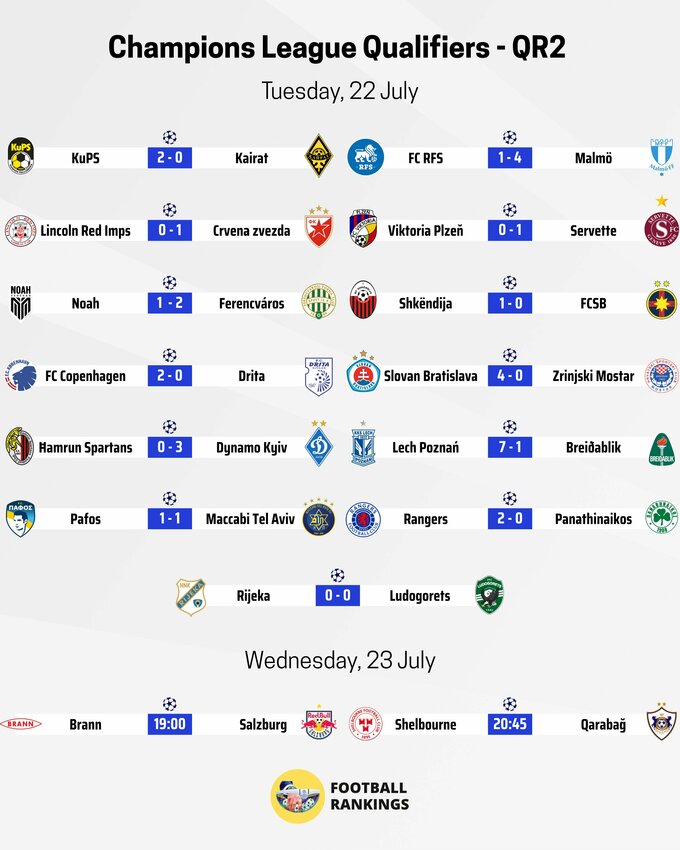 Вечером 22 июля состоялись первые матчи 2-го раунда квалификации Лиги чемпионов 2025/26.