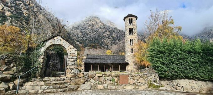 Если въезжать в Андорру со стороны Испании и ехать на север вдоль реки Гран Валира, то попадешь в столицу Андорры, город Андорра-ла-Велла. Но перед въездом в столицу дорога проходит мимо старинной церкви, строительство которой началось еще в 8-м столетии, а колокольню возвели в 12-м веке. Эта церковь также изображена на монетах Евро, отчеканенных в Андорре, а старинные муралы из нее, созданные в 12-м веке, в 1933-м году были вывезены в Германию, а в 2007-м вернулись в Андорру и сейчас их можно увидеть в Правительственном выставочном зале Андорры.