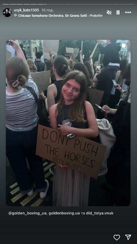 На митинги отреагировала Екатерина Усик, жена трехкратного абсолютного чемпиона мира по боксу Александра Усика. В Stories своего Instagram-аккаунта она распространила публикации, критикующие новый законопроект или поддерживающие протестующих. Один из репостов Екатерины сопровождается композицией группы «Скрябин» – «Кинули».