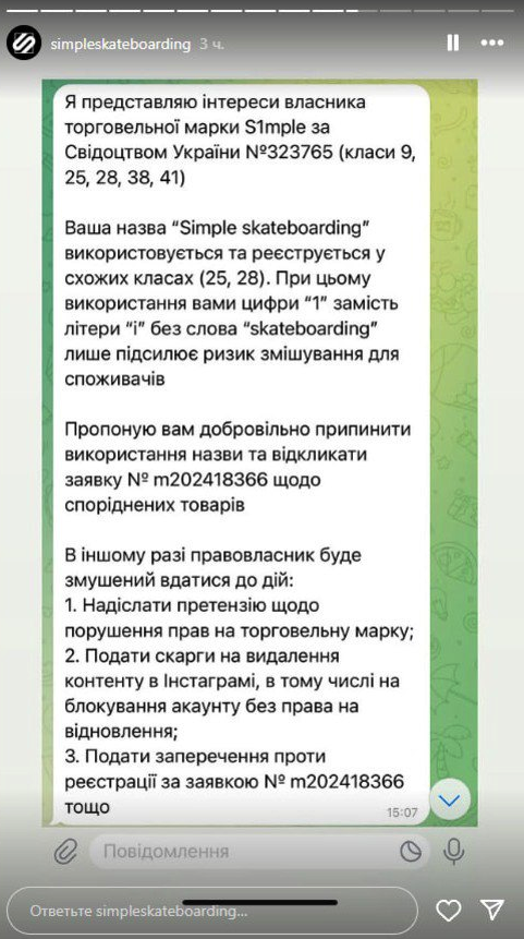 По мнению представителей игрока, название скейтбренда слишком похоже на торговую марку s1mple (№323765), что якобы может вводить покупателей в заблуждение. В обращении юристы призвали добровольно отказаться от регистрации торговой марки Simple Skateboarding (№m202418366).
