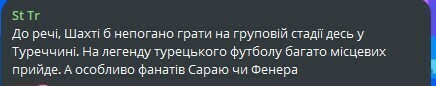 St Tr: Кстати, Шахте было бы неплохо играть на групповом этапе где-нибудь в Турции. На легенду турецкого футбола придет много местных болельщиков. А особенно фанатов Сарая или Фенера.