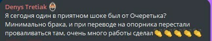 Denys Tretiak: Я сегодня один в приятном шоке был от Очеретько? Минимально брака, и при переводе на опорника перестали проваливаться там, очень много работы сделал👏👏👏👏👏