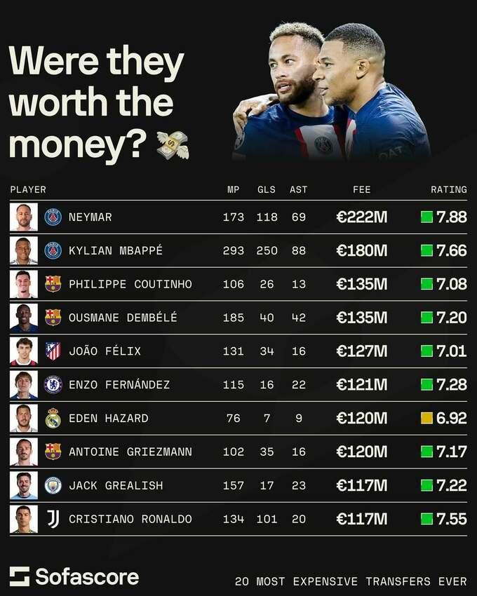 Самые дорогие трансферы в истории и статистика игроков за новый клуб